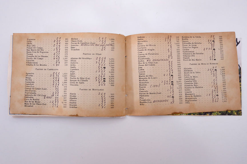Me regalaron un libro titulado “ Portfolio Fotográfico de España”, editado en el año 1920, donde aparece una lista de todos los municipios de la provincia de Teruel con sus habitantes, así como imágenes emblemáticas de la provincia. Le añadí los habitantes censados en el año 2018 de los municipios que aparecen, así como aquellos que ya no existen. Superpuse las imágenes del libro por otras recientes realizadas en la comarca del Maestrazgo y escribí con tinta visible con luz ultravioleta, un pie de texto para cada imagen.